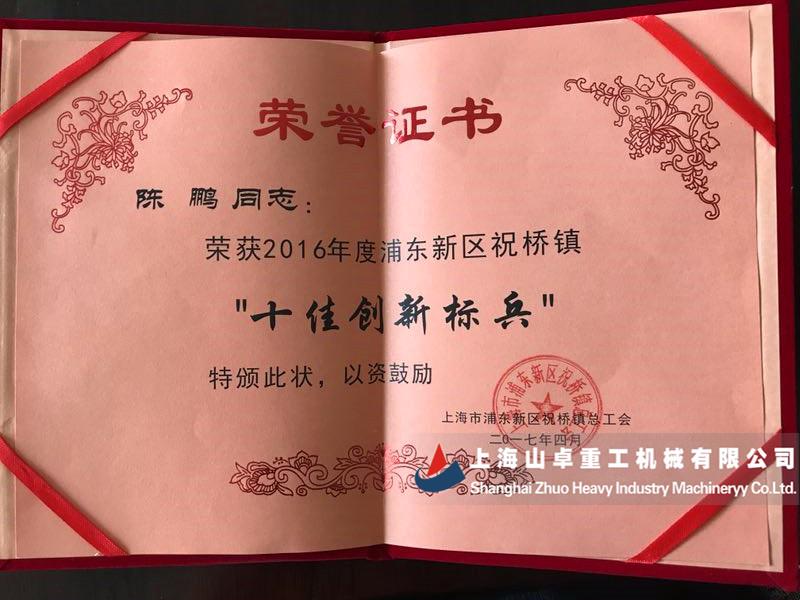 熱烈祝賀上海山卓重工陳鵬獲得2016年度浦東新區祝橋鎮“十佳創新標兵”